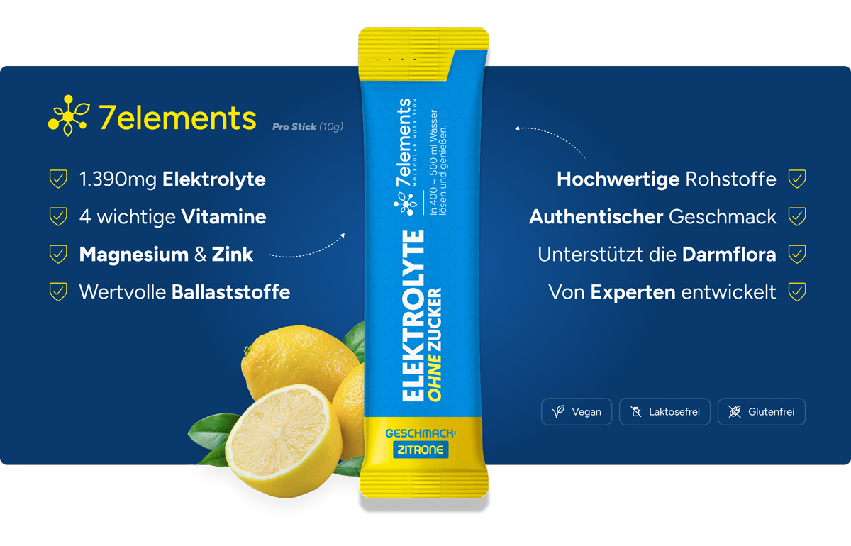 Elektrolyte sind lebensnotwendige Mineralstoffe – darunter Natrium, Kalium, Magnesium, Kalzium und Chlorid –, die in Körperflüssigkeiten elektrisch geladen vorliegen. Sie regulieren den Wasserhaushalt, ermöglichen Muskelkontraktionen, leiten Nervenimpulse weiter und stabilisieren den pH-Wert im Blut. Da dein Körper Elektrolyte nicht selbst herstellen kann, müssen sie täglich über Nahrung oder Getränke zugeführt werden. Bei starkem Schwitzen, Sport oder Erkrankungen steigt der Bedarf spürbar an.