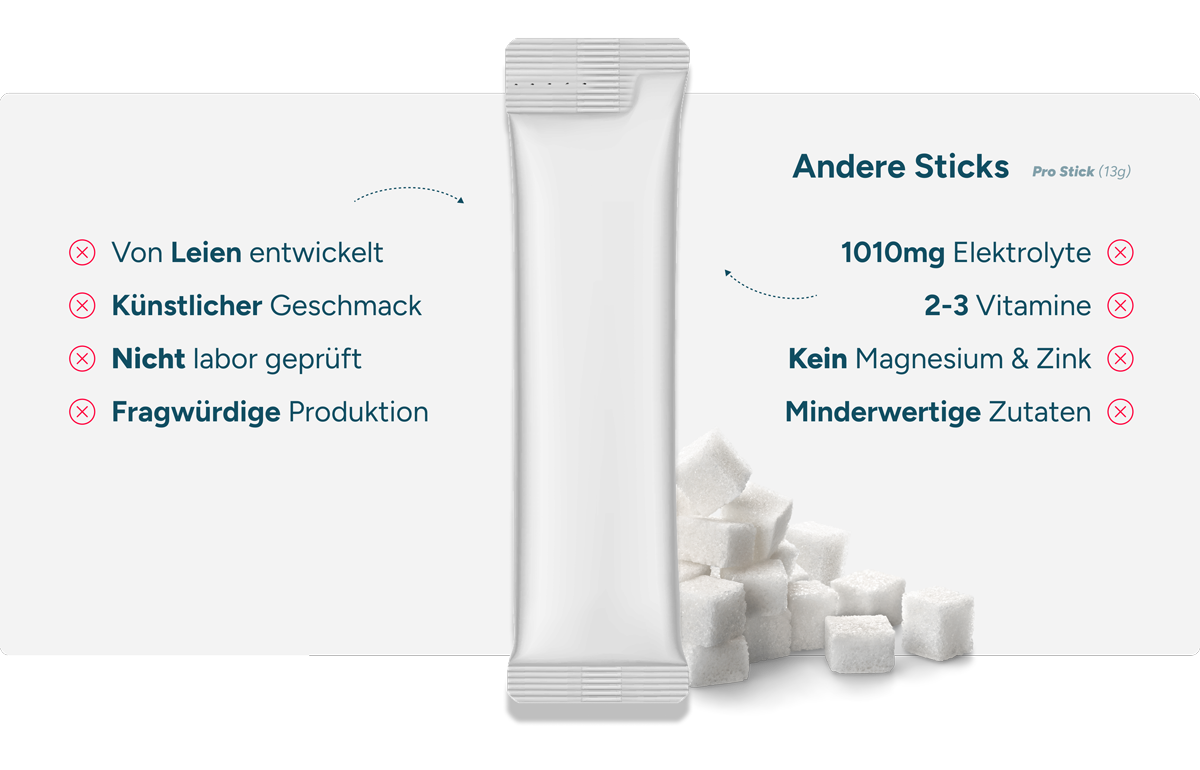 Herkömmliche Sportgetränke wie Isostar oder Powerade enthalten häufig hohe Mengen an Zucker, künstliche Aromen und Farbstoffe – oft mehr als 6 g Zucker pro 100 ml. Unser Elektrolytprodukt setzt auf eine wissenschaftlich fundierte Mineralstoff-Zusammensetzung ohne unnötige Zusätze: kein Industriezucker, keine künstlichen Aromen und eine optimale Natrium-Kalium-Magnesium-Balance für echte Hydration. So bekommst du alles, was dein Körper braucht – und nichts, was er nicht braucht.
